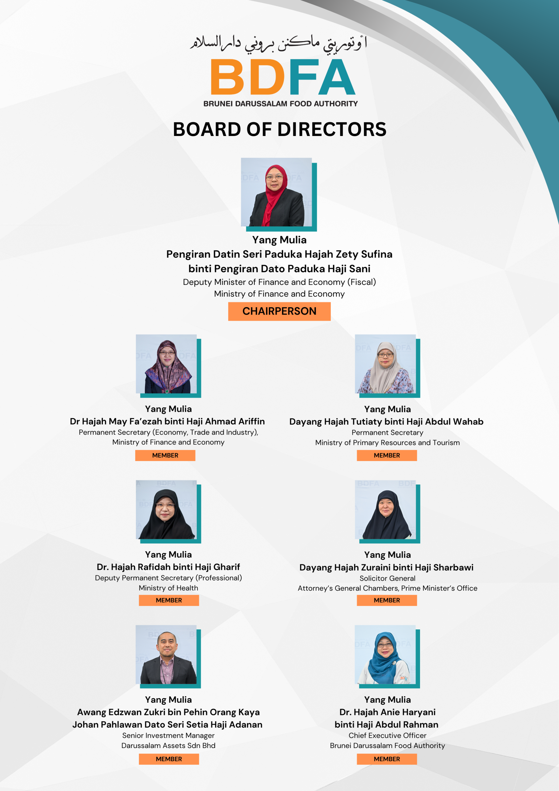 BDFA consists of a multidisciplinary team committed to ensure the vision and mission is achieved. From food products imported and exported to how food hygiene protocols and standards is practiced, BDFA’s team is conducive to create cohesive team to achieve food safety for Brunei Darussalam.